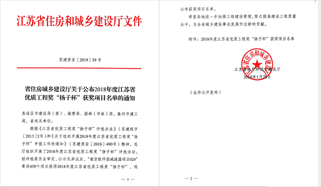 江蘇省住房和城鄉建設廳根據《江蘇省優質工程獎“揚子杯”評選辦法》和《關于組織開展2018年度江蘇省優質工程獎“揚子杯”申報工作的通知》,經評選委員會審定、公示無異議后,由我公司參建的“蘇州市中環快速路北段工程”榮獲2018年度江蘇省優質工程獎“揚子杯”榮譽稱號。